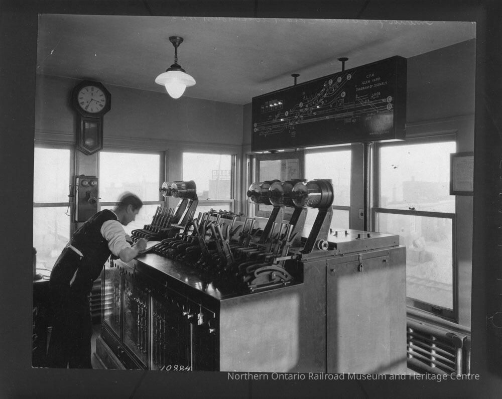 Photograph, Interior of Canadian Pacific Railways switch control station at Glen Yard.Collection
