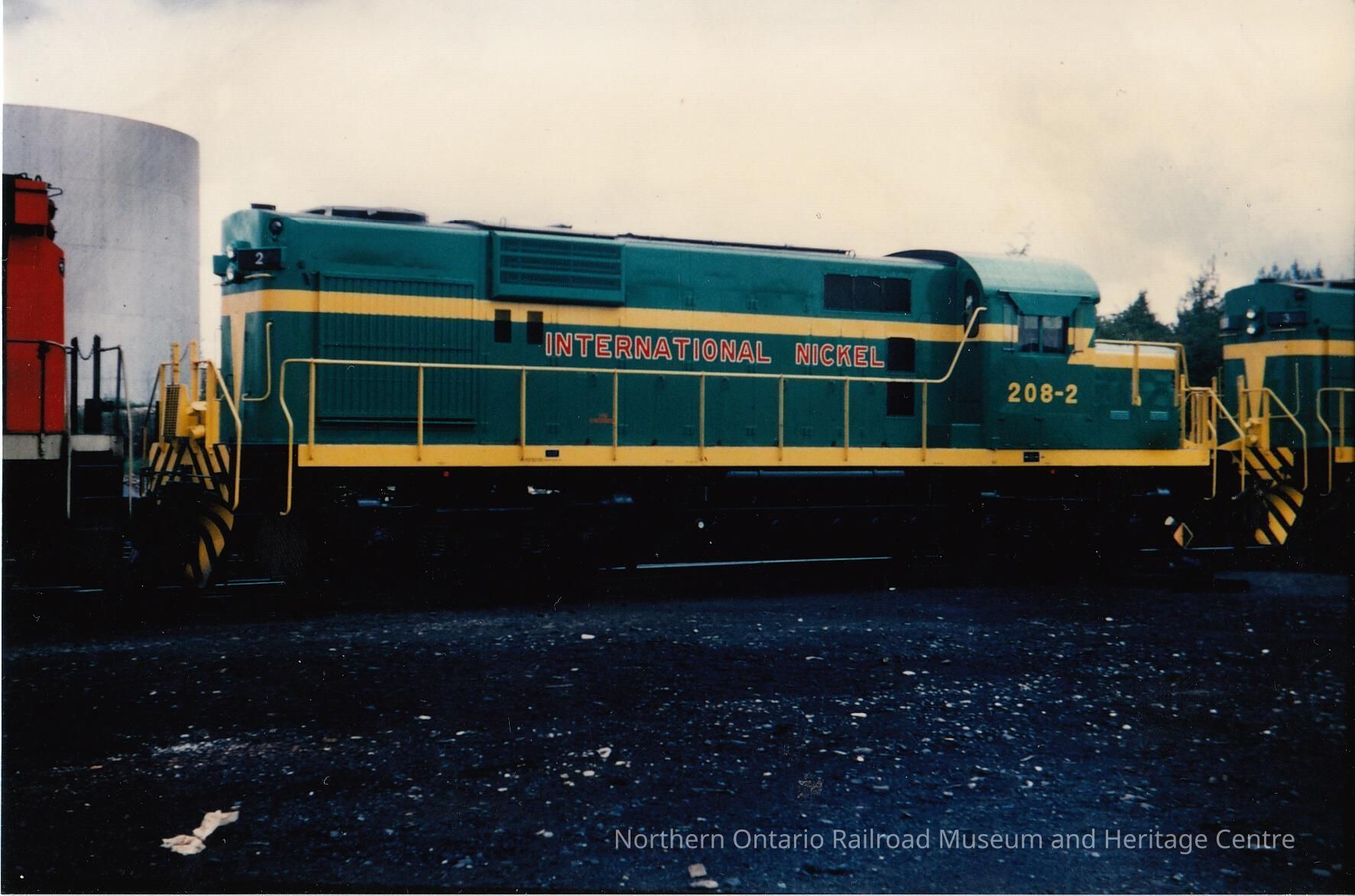 Colour- A photograph depicting International Nickel engine no. 208-2, painted green and yellow, sitting in a rail yard.Collection