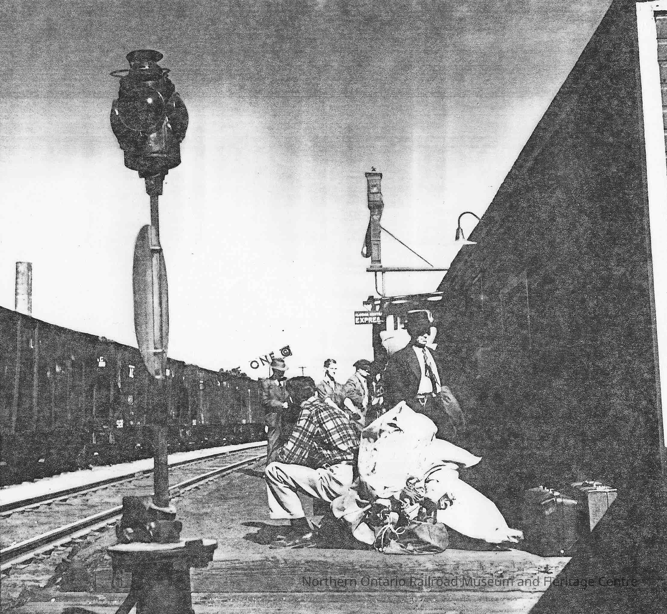 Photocopy of a photograph of a group of people standing on the platform of the Jamestown station, 1948.