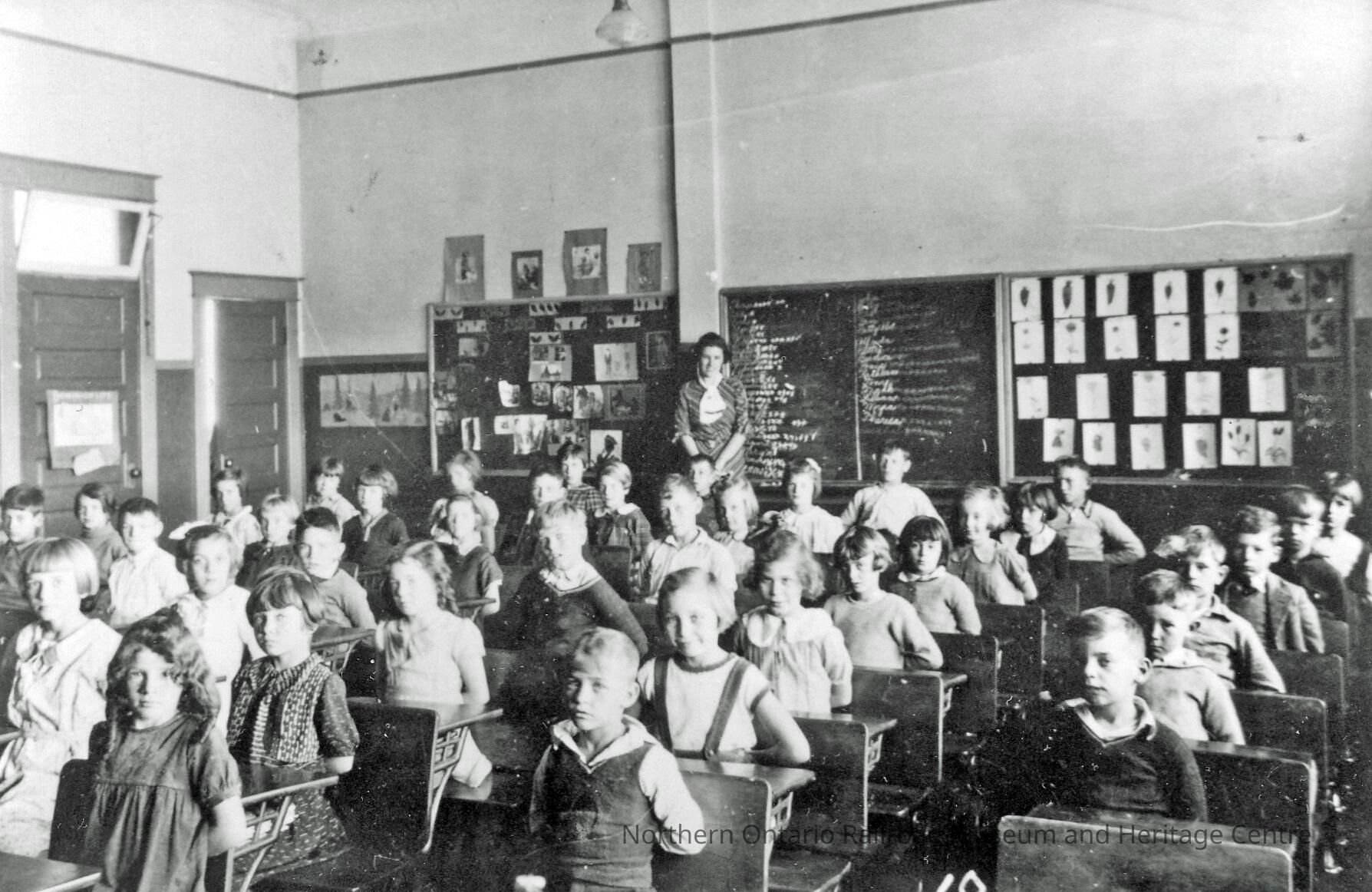 Black and White- A group of younger children sit in their desks while their photo is taken. Behind them is their teacher. There are several handwritten words written on the chalkboard.Collection