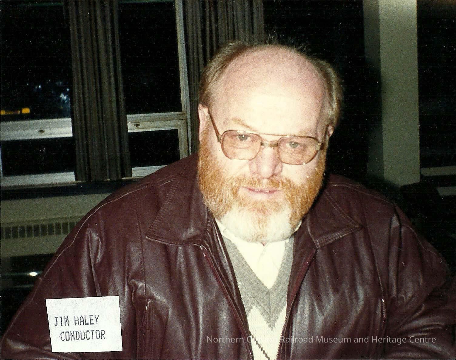 Coloured photograph showing Jim Haley, who was a conductor for Canadian National. He is pictured in a brown leather jacket and a grey and white argyle print sweaterPhotograph Details