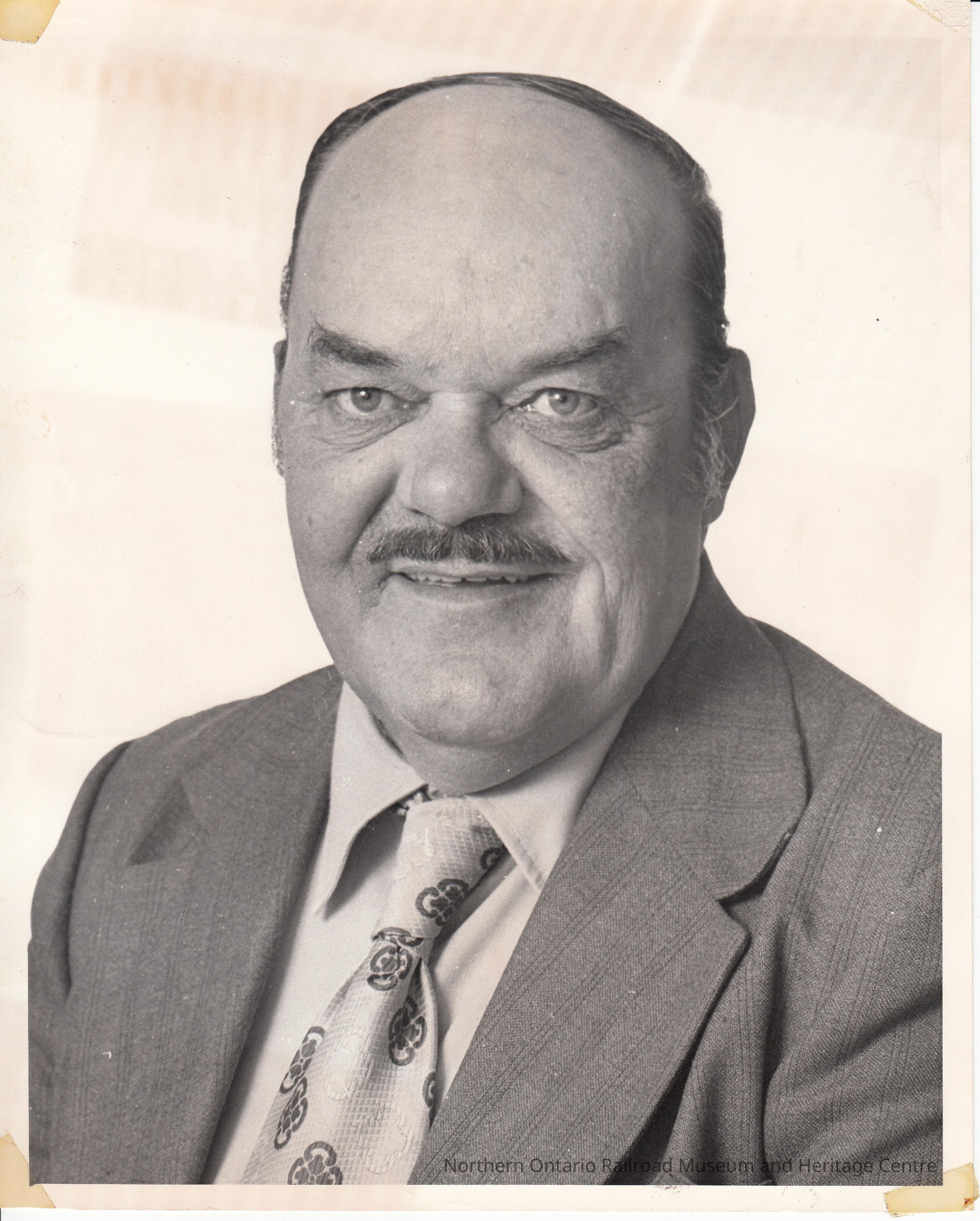 Black and white- A portrait photograph depicting Joseph Fougere, a Capreol police officer who joined the force in 1962. He wears a suit and floral pattern tie.Collection
