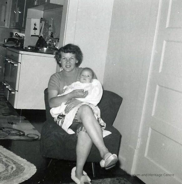 Digital reproduction of a black and white photograph of Joyce Sweezey seated in a chair, holding her young son Patrick on her lap in their apartment above the Capreol fire hall, October 1956.