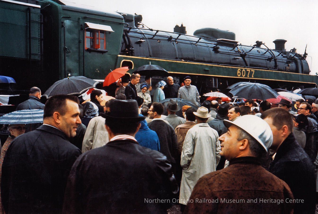 Colour photograph of a large group looking towards steam locomotive no. 6077. Many people holding umbrellas or wearing hats. Approximately eight people stand in front of 6077 looking towards the crowd. Tom McKinley likely among the latter group.