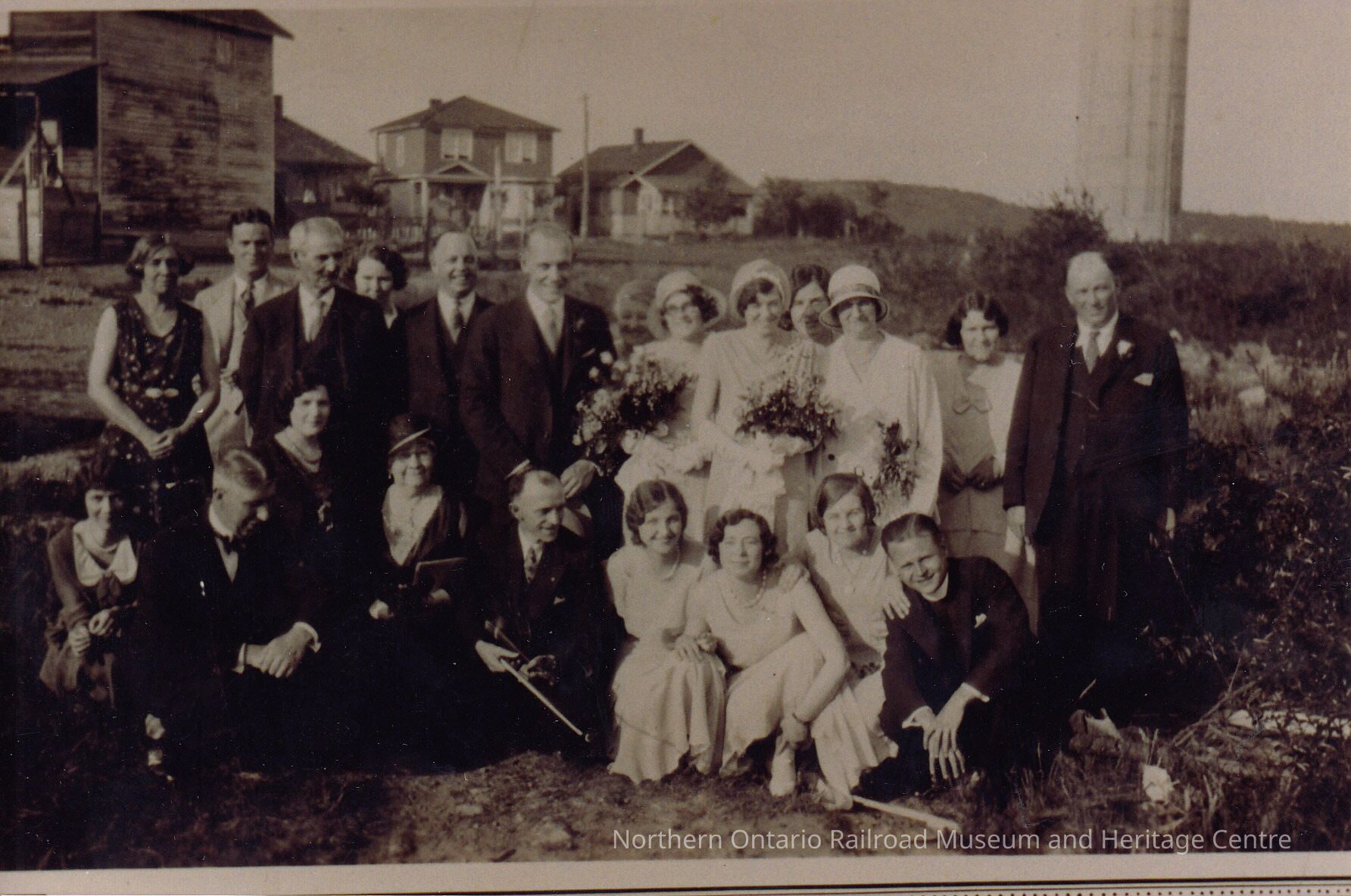 Black and white- A group photograph of people at a wedding, taken outside. Some of those depicted are Laura Moore and Bill Johnson (the bride and groom), Gladys Moore Cleminson (the bridesmaid), Richard "Dick" Moore , and Lauren Moore (the parents of the bride), and Rev. Ted Tucker. Also in this picture is Emma Admas.Collection