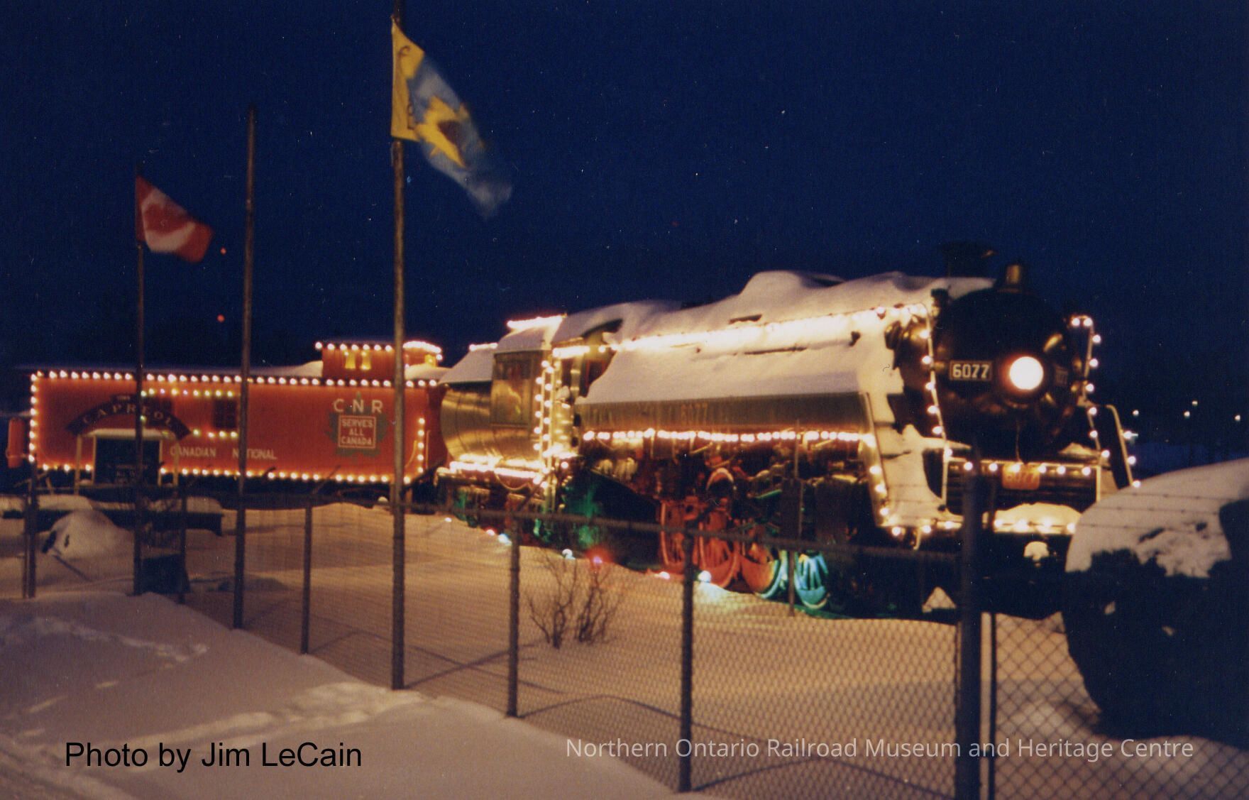 Digital copy of a black and white photograph of locomotive 6077 in Prescott Park, decorated with Christmas lights in the winter.Collection