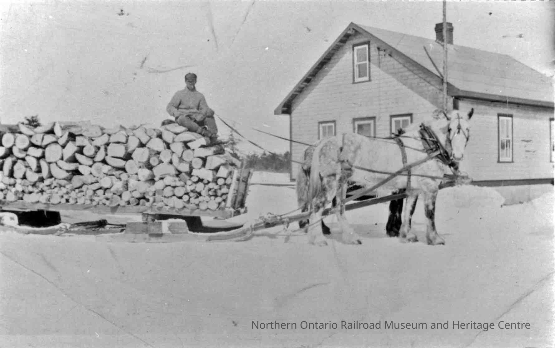 Black and White- Mayron Dunn sits atop a pile of logs piled onto a horse drawn sleigh in the winter.