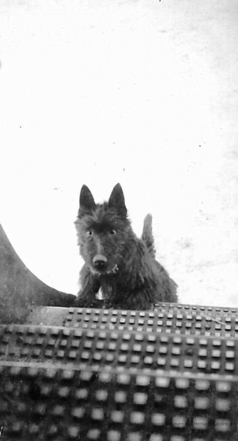 Digital reproduction of a black and white photograph of Mac, Angus and Helen McKay's dog, at the bottom of the stairs leading to the school car (?).