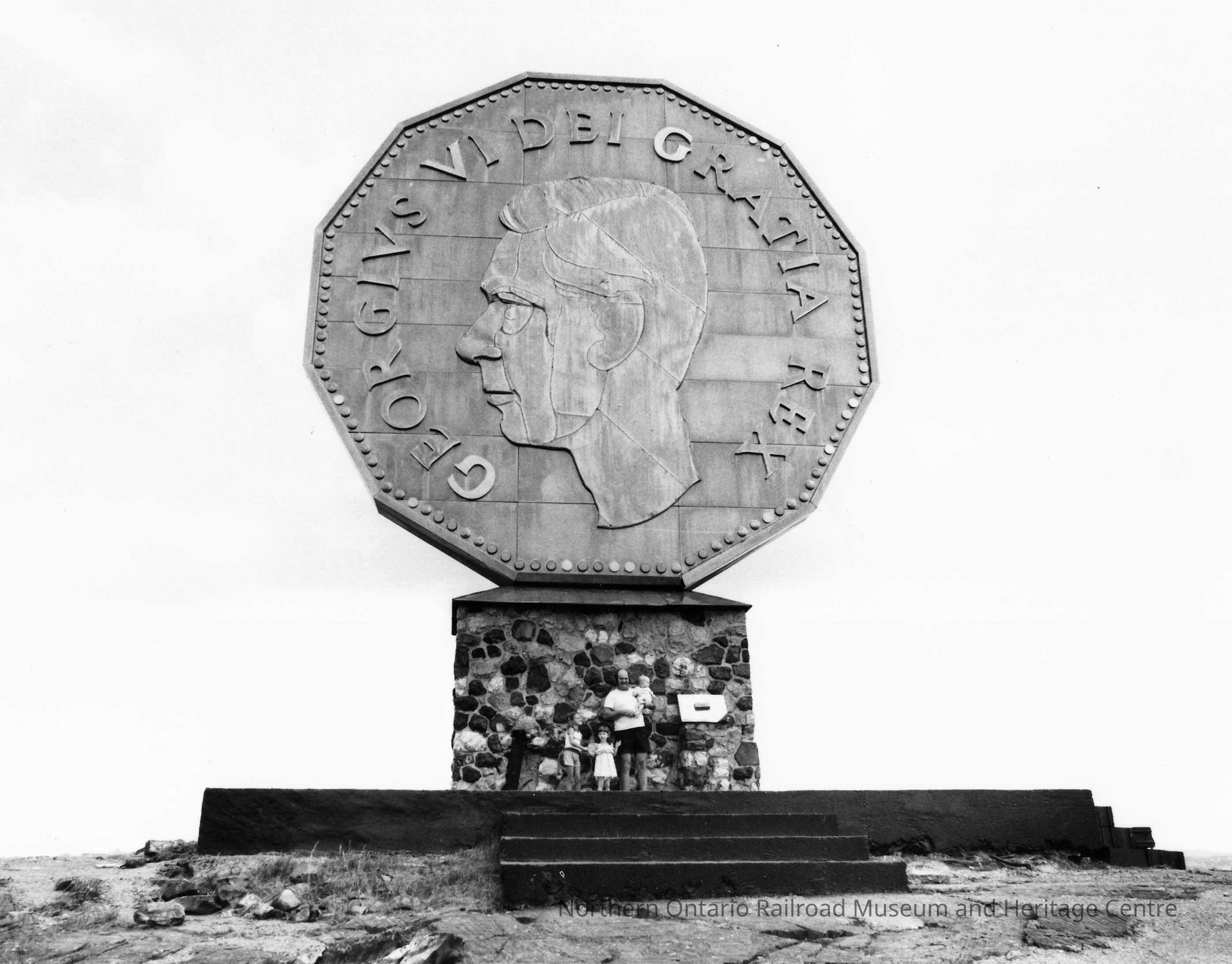 Black and white photograph of a man holding a baby, standing with two young girls in front of the Big Nickel in Sudbury, Ontario, Canada.Collection