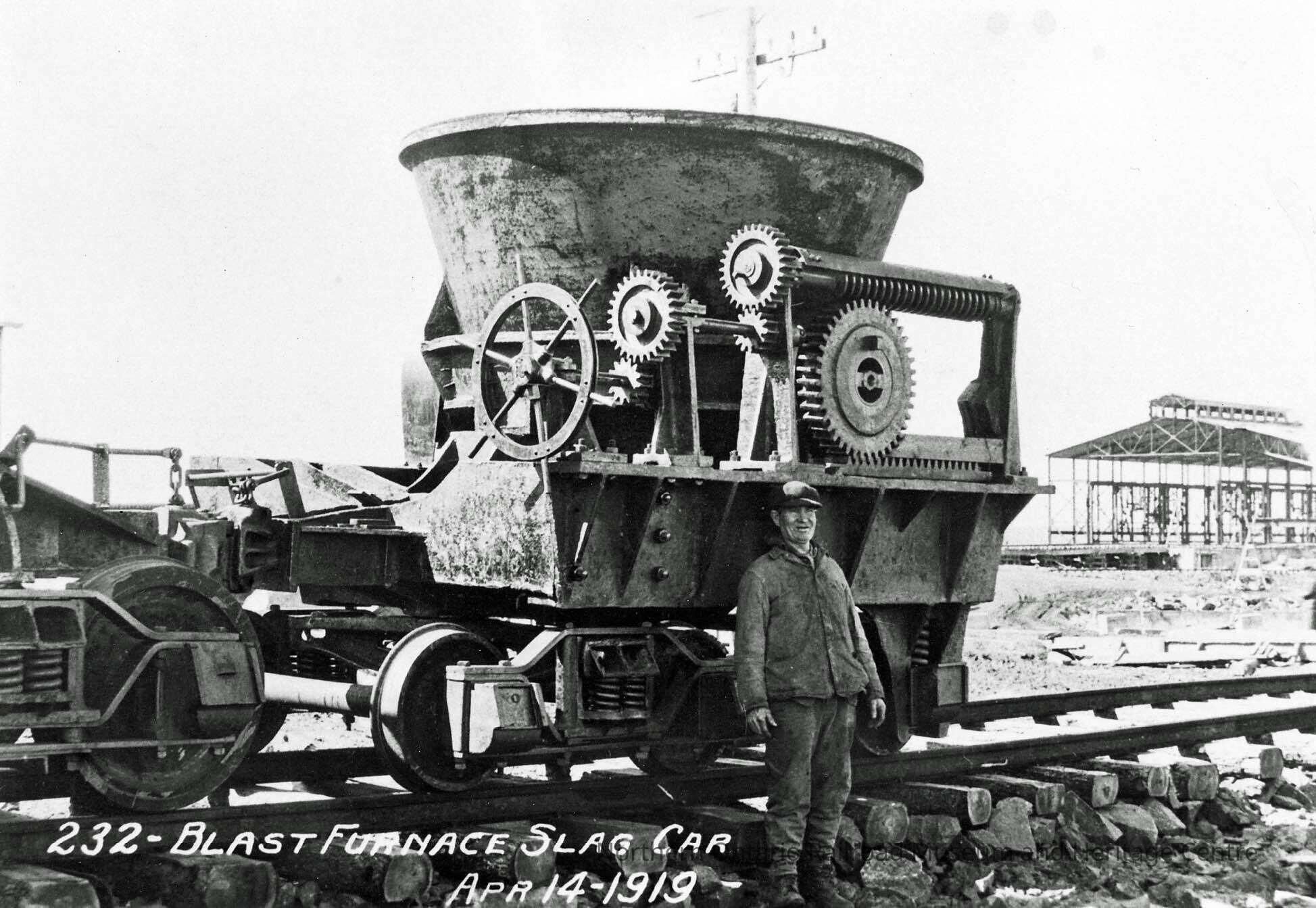 Photograph - Man posing with blast furnace slag car, 1919Entry/Object ID