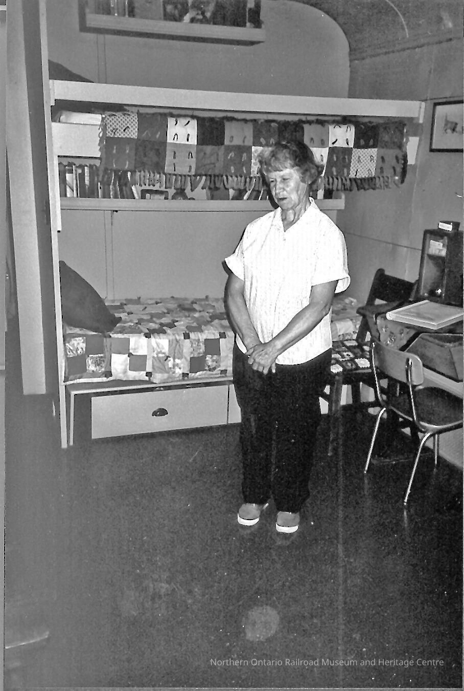 Digital reproduction of a black and white photograph of Margaret Sloman in a school car (?) at Clinton, 1994. She stands with her hands folded in front of her, before bunk beds and a school desk.