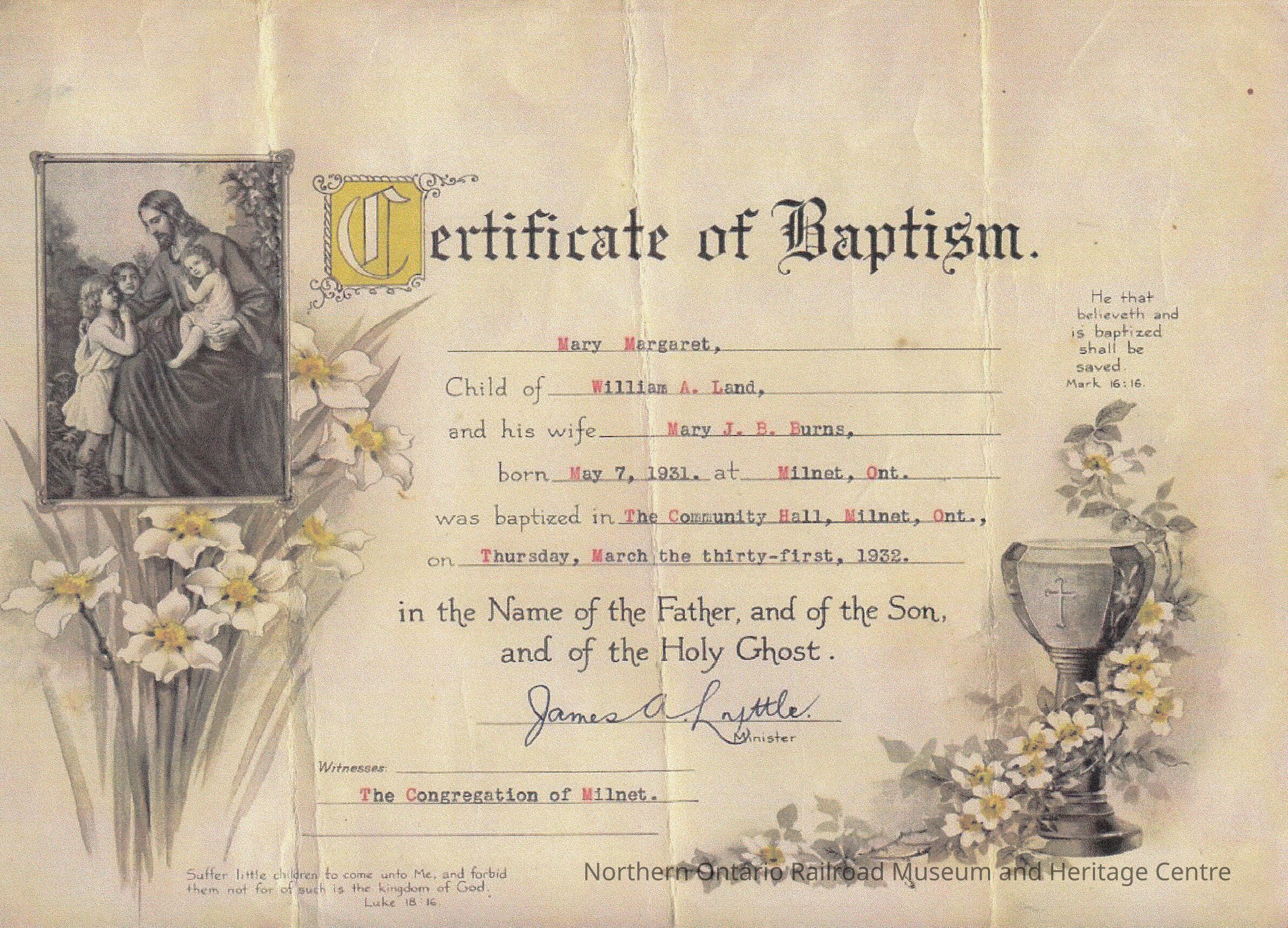 Black and White- A certificate of Baptism for Mary Margaret Land. Includes a drawing of Luke 18:16.Collection