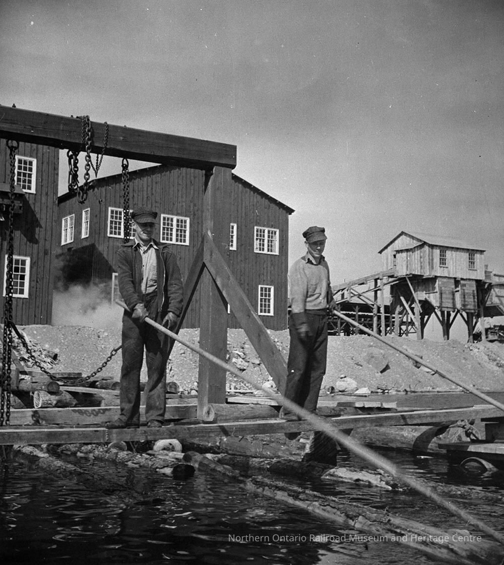 Photograph, Men feeding the jackladder at Temagami, Gillies Bros. sawmill. Mill sut down permanently on Nov. 1957 and dismantled in about 1970.Collection