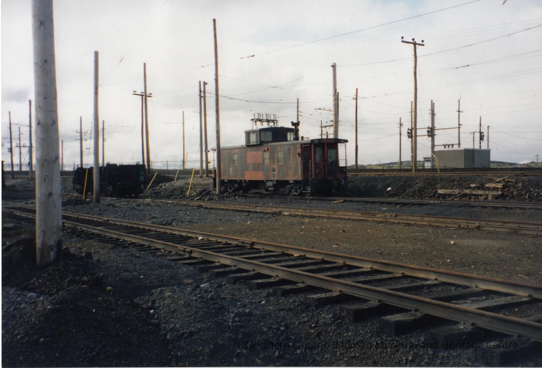 Colour- A photograph depicting a metal caboose, in bad condition and stripped of paint, sitting in a rail yard.Collection