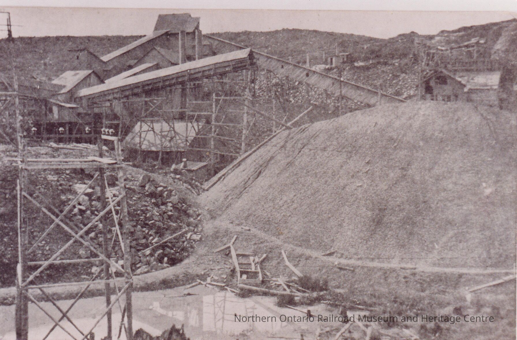 Black and White- A series of conveyor belts cover the landscape. In the foreground is a large pile of gravel or dirt.Collection