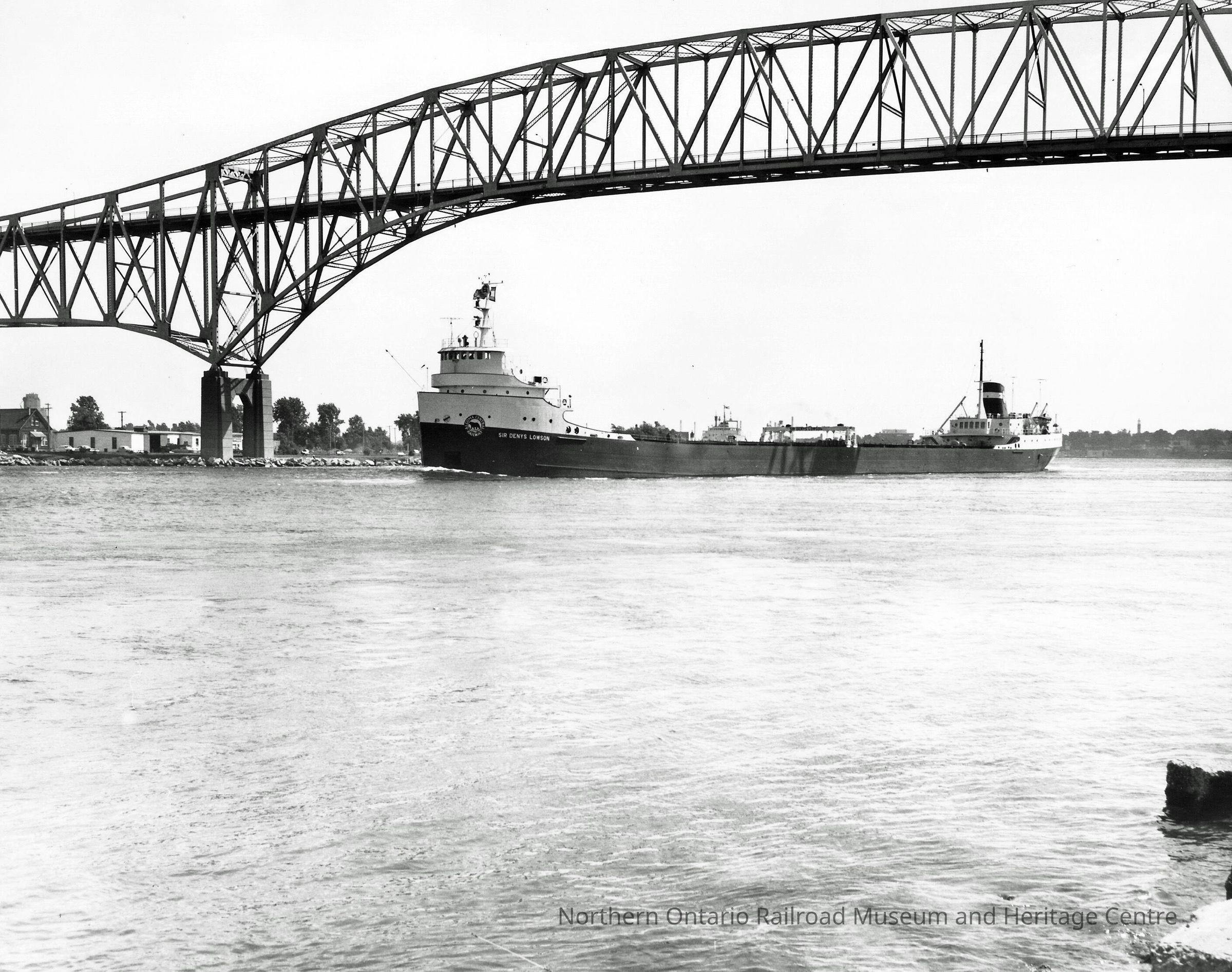 Black and white photograph of the motor vessel Sir Denys Lowson in the St. Clair River beneath the Blue Water Bridge, Port Huron, Michigan.Collection