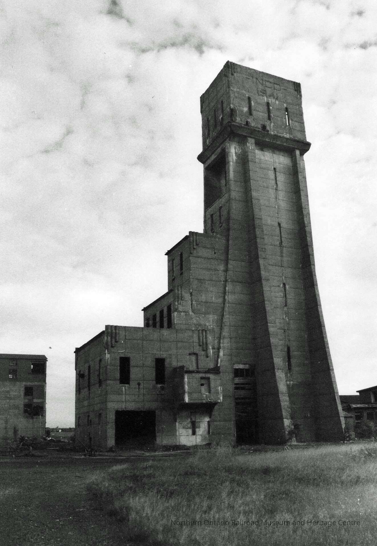 Black and white photograph of the HO frame at Murray Mine built in 1941, Sudbury, Ontario, Canada. Setpember 1995.Collection