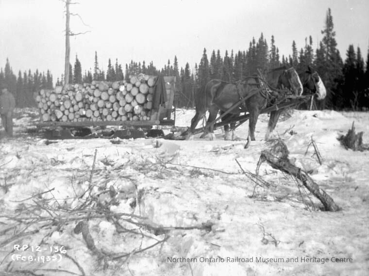 Photograph, Nakina, Ontario, hauling wood, February 1935.Collection