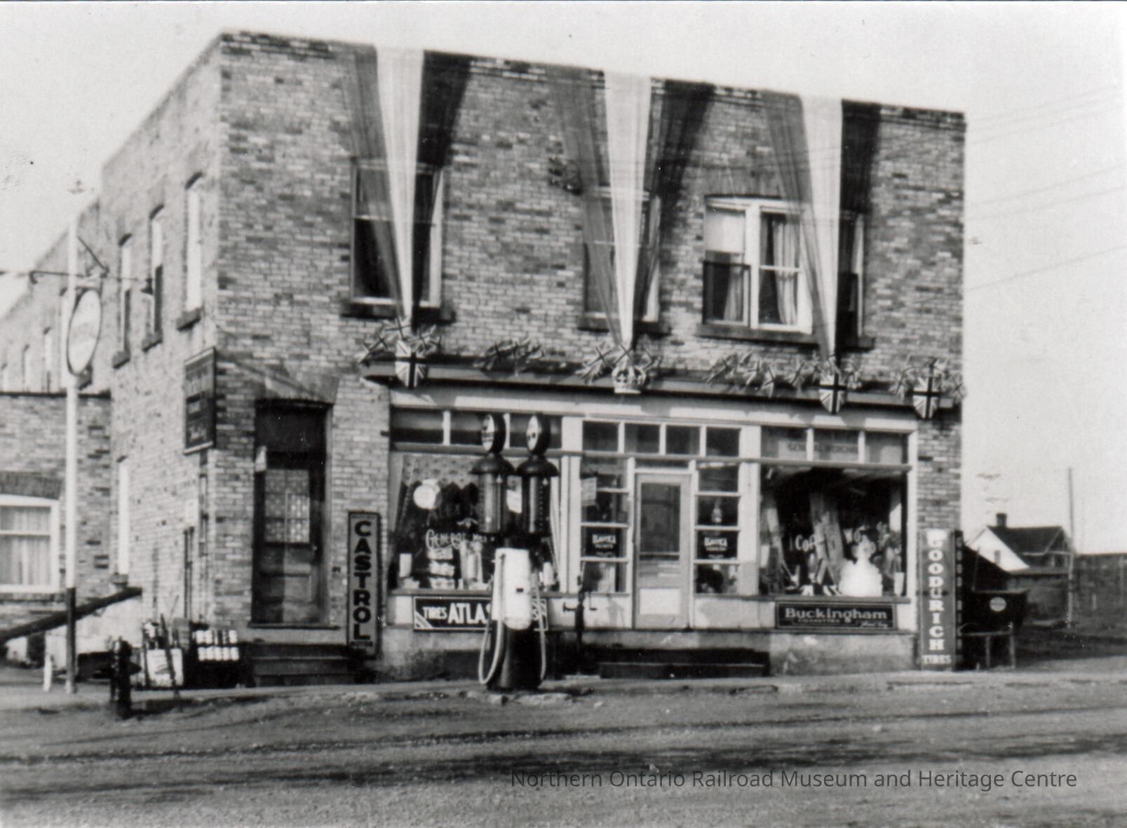 Black and White- A photograph of Nepitt's Store. From the roof is suspended three long curtains. There is a gas pump in front, as well as a sign advertising Castrol.Collection