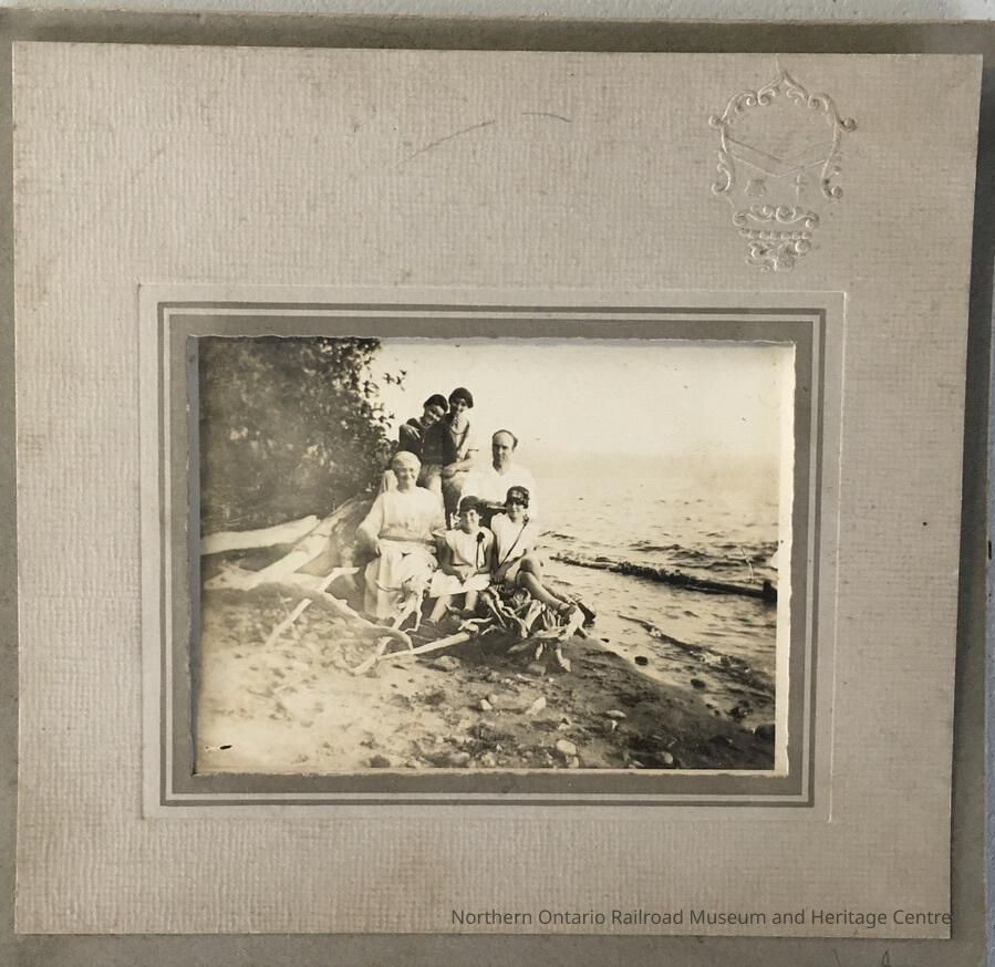 Early 20th century family portrait of 6 people by a river. Black and white in a gray on gray period cardboard frame