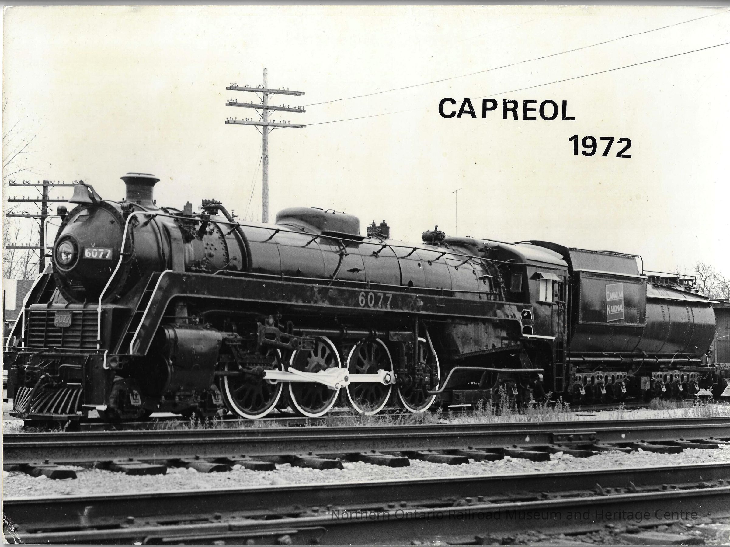 Historic photograph of CNR steam locomotive #6077 in Capreol in 1972. There are power lines in the background and train tracks in the foreground. Black and white photographContext