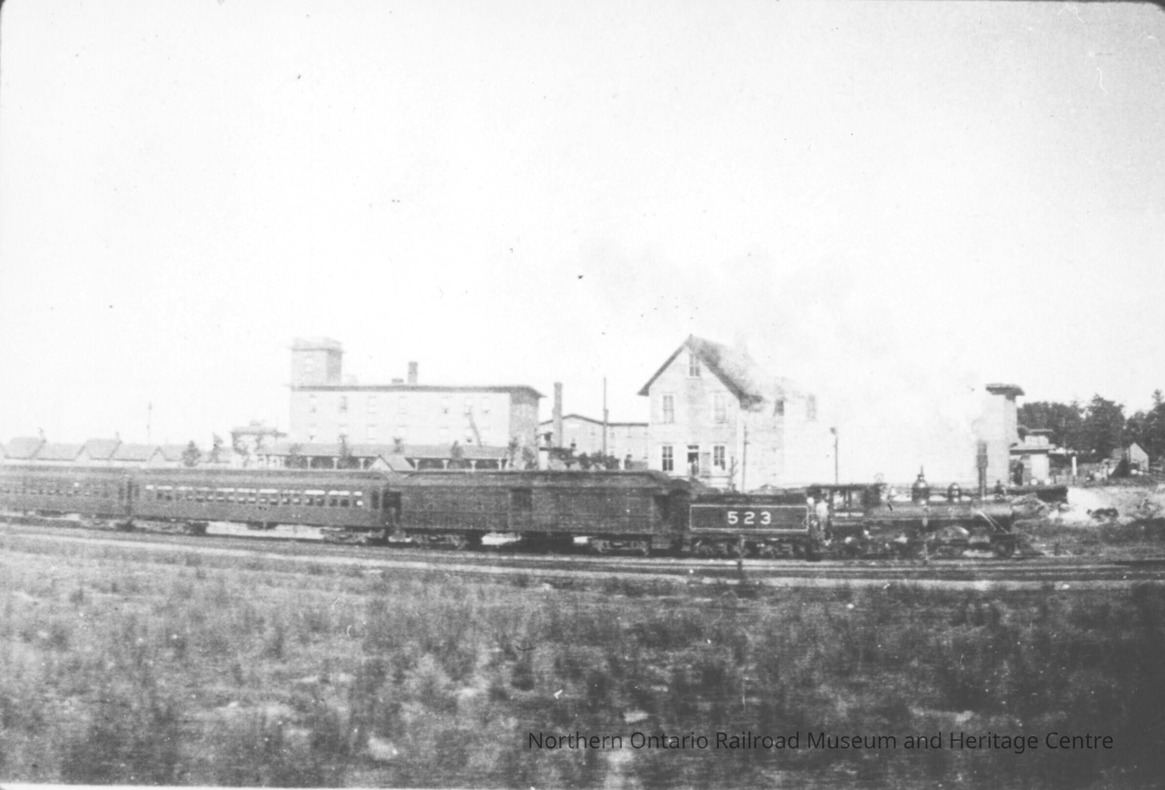 Black and white photograph of a passenger train traveling through Depot Harbour in 1900. It is a steam powered locomotive, the number on the locomotive is "523". It is assumed to be a Canada Atlantic train. Behind the train there are houses and other buildings visible.