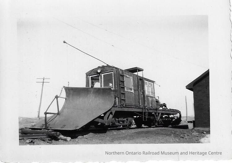 Photograph showing a line car with a large spade on the front of it. It appears to be at a station. The line car was owned by the Sudbury Copper Cliff Suburban Electric Railway.Photograph Details