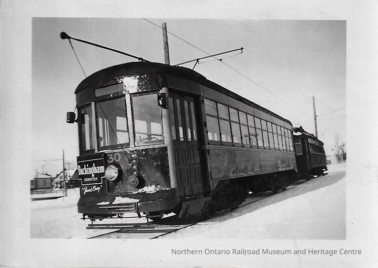 Photograph of a streetcar in Sudbury. The streetcar appears to be passing through an area. It also has an advertisement for "Buckingham Cigarettes" on the front of it.Photograph Details