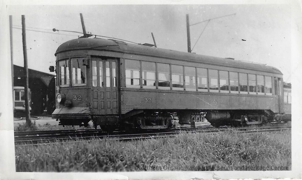 Photograph showing a streetcar in Sudbury. The streetcar appears to be mid-route. It is car number 32.Photograph Details