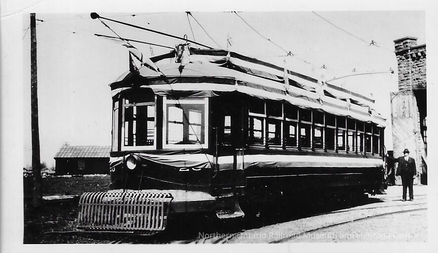 Photograph showing a streetcar in Sault Ste Marie. The streetcar appears to be parked at a station, and there is a man in a suit visible in the photograph. The streetcar was owned by the International Transit Company.