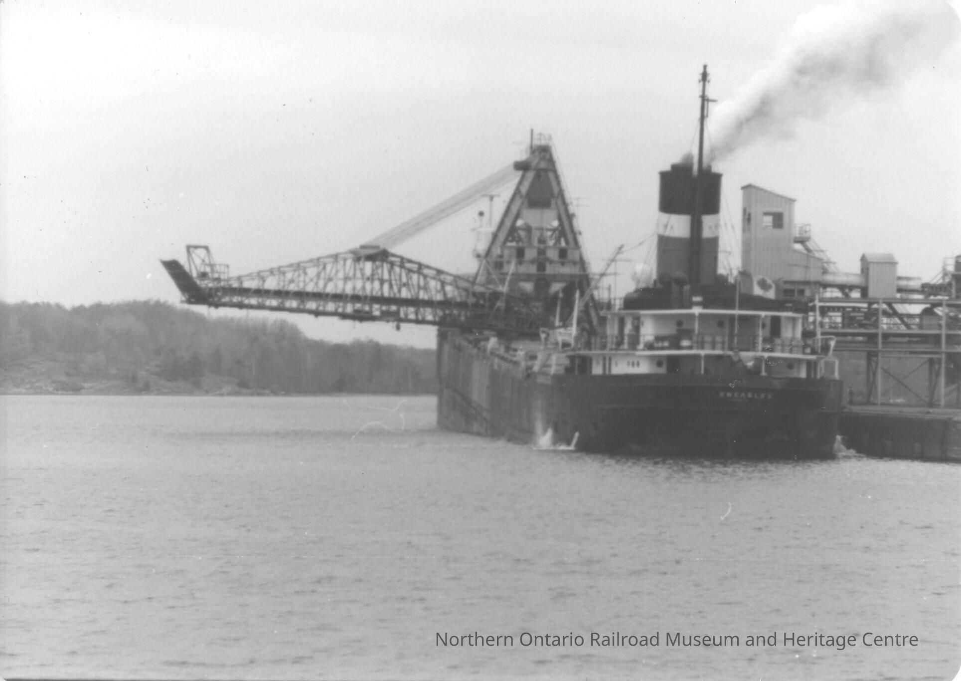 Black and white photograph of an iron ore self-unloader docked in Depot Harbour. It will clearly be delivering its cargo of iron ore pellets to a place where dock space is limited and facilities not able to help with unloadingPhotograph Details
