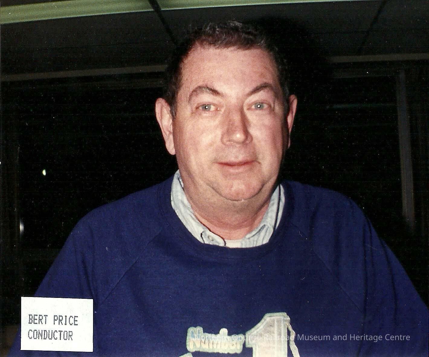Coloured photograph showing Bert Price, a Canadian National Conductor. He is pictured in a dark blue crew neck sweater with a striped button down underneath. The sweater reads "number 1" in gold lettering.Photograph Details