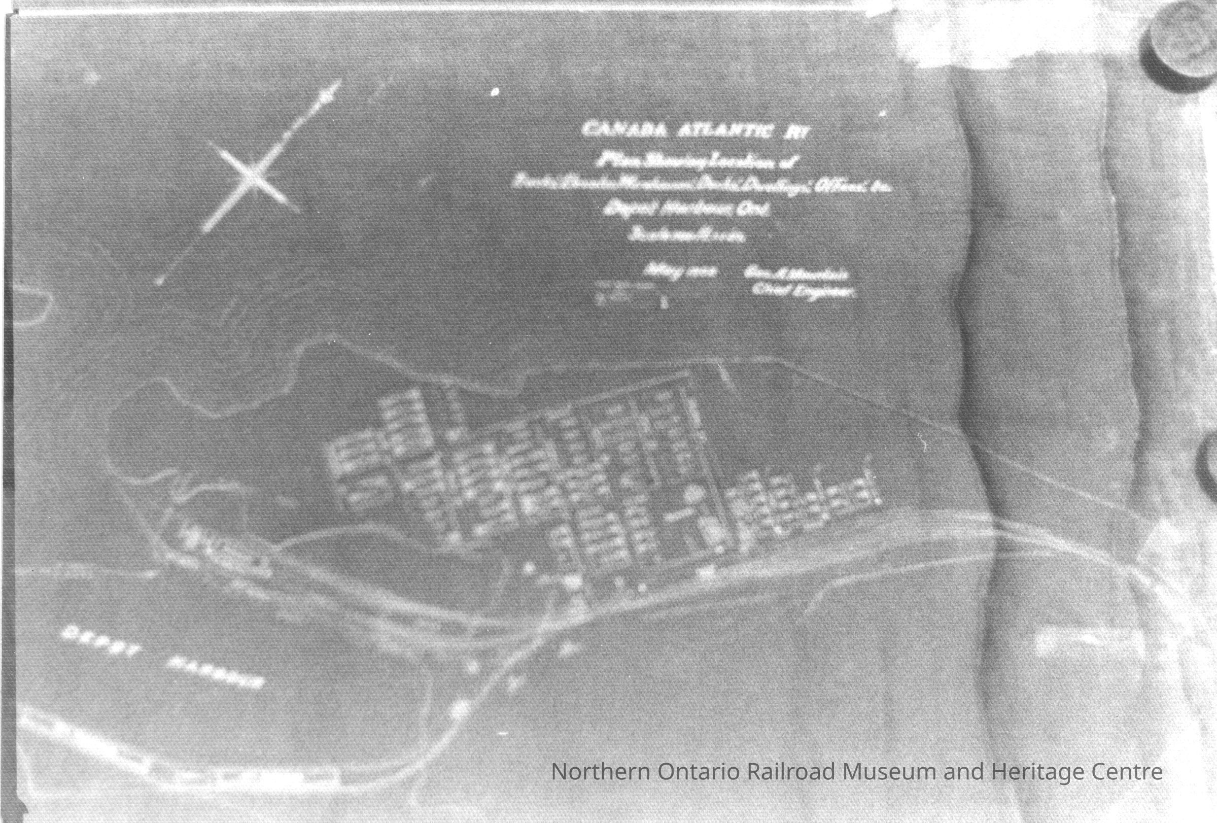 Photograph showing the plans for the location of the Tracks' Elevation Warehouse Decks' Dwelling Office in Depot Harbour Ontario. The photo shows of the plans to construct this warehouse close to the harbour. It is an Arial shot of the town and shows the proximity to the harbour. The warehouse was going to be constructed by the Canada Atlantic Railway.