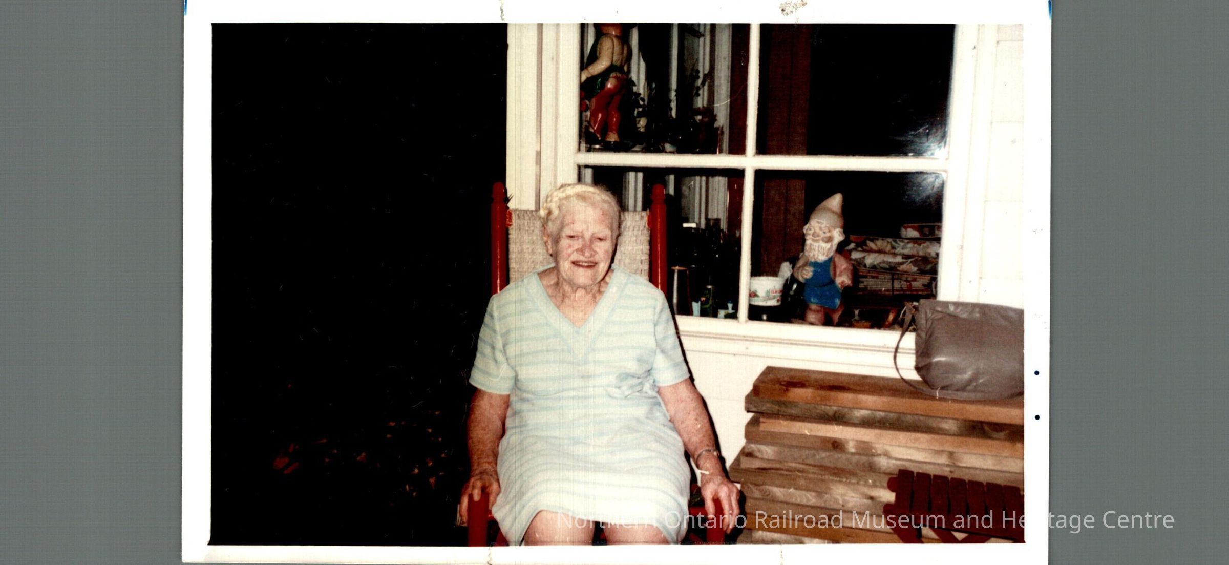 Photograph of Cela Sloman. Cela Sloman and her husband Fred worked on Canadian National School Car No. 1 from 1926 until 1964, it ran from Capreol to Foleyet. Cela was always known for her kindness and she ensured the students and their families were always cared for.Collection