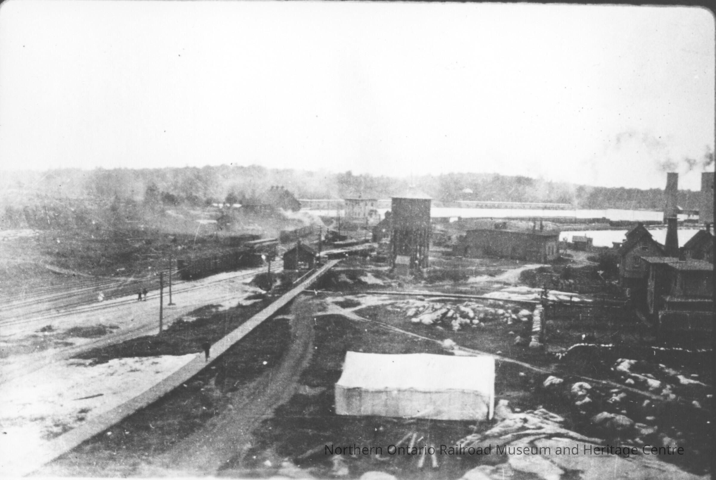 Black and white photograph of Depot Harbour. This photograph shows the town itself as well as the railway that crosses through it. There are several people walking in this photograph, as well as houses and other buildings. The Grand Trunk grain elevators and harbour itself are also shown.