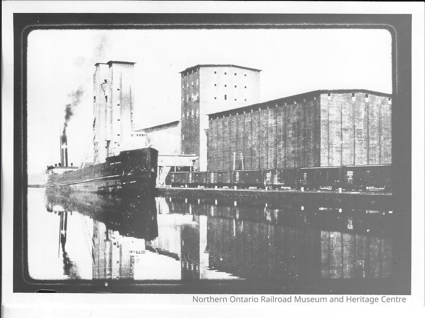 Black and white photograph of Depot Harbour, showing the now complete grain elevators. The photograph was taken from land and shows a steam liner docked alongside a large building, at this building there are two large grain elevators. Also visible in front of the building is a line of train cars, assumed to be being loaded onto the steam liner.