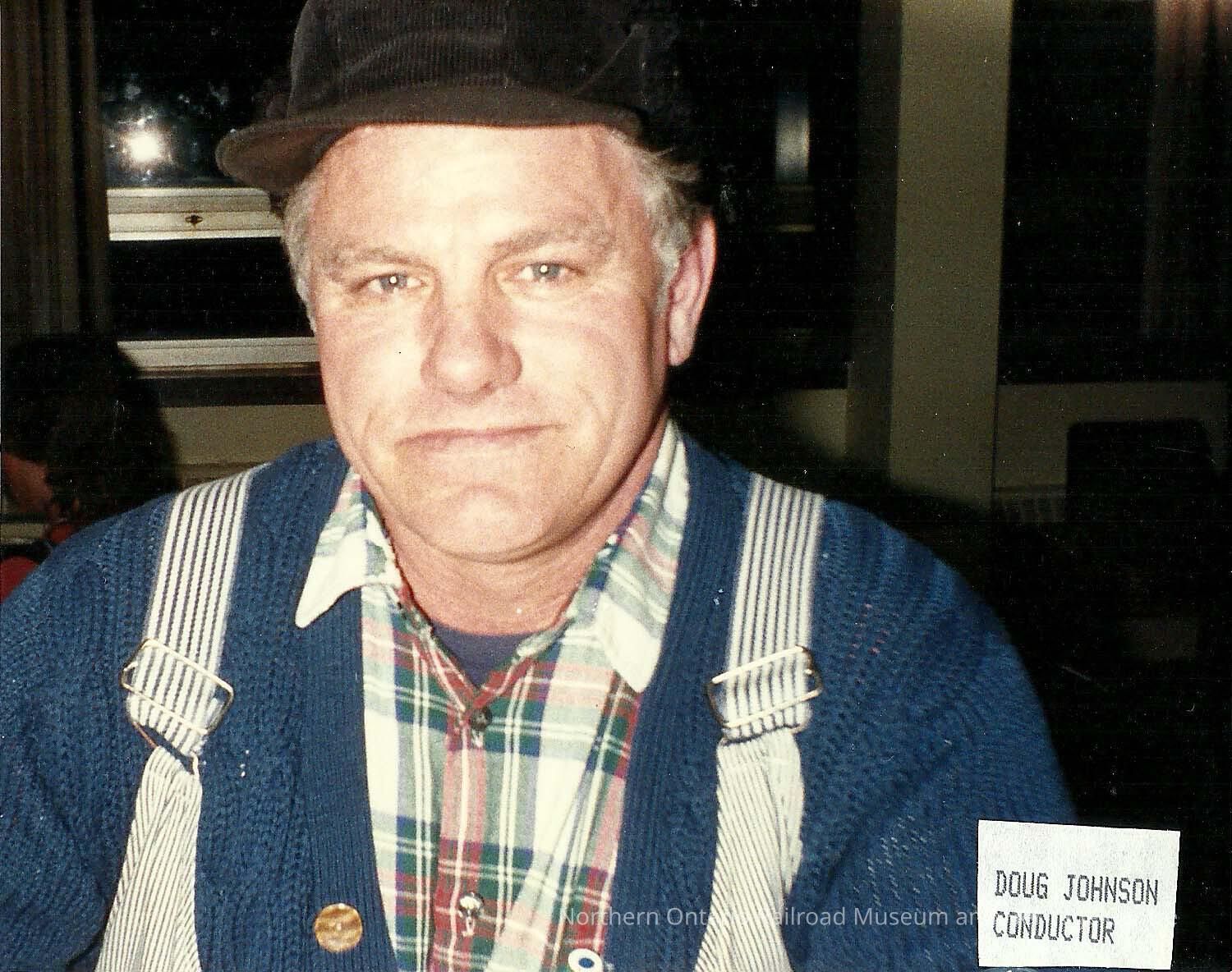 Coloured photograph of Doug Johnson, a Canadian National conductor. He is pictured in a plaid button down shirt, a blue knit sweater, striped overalls, and a black cap.Photograph Details