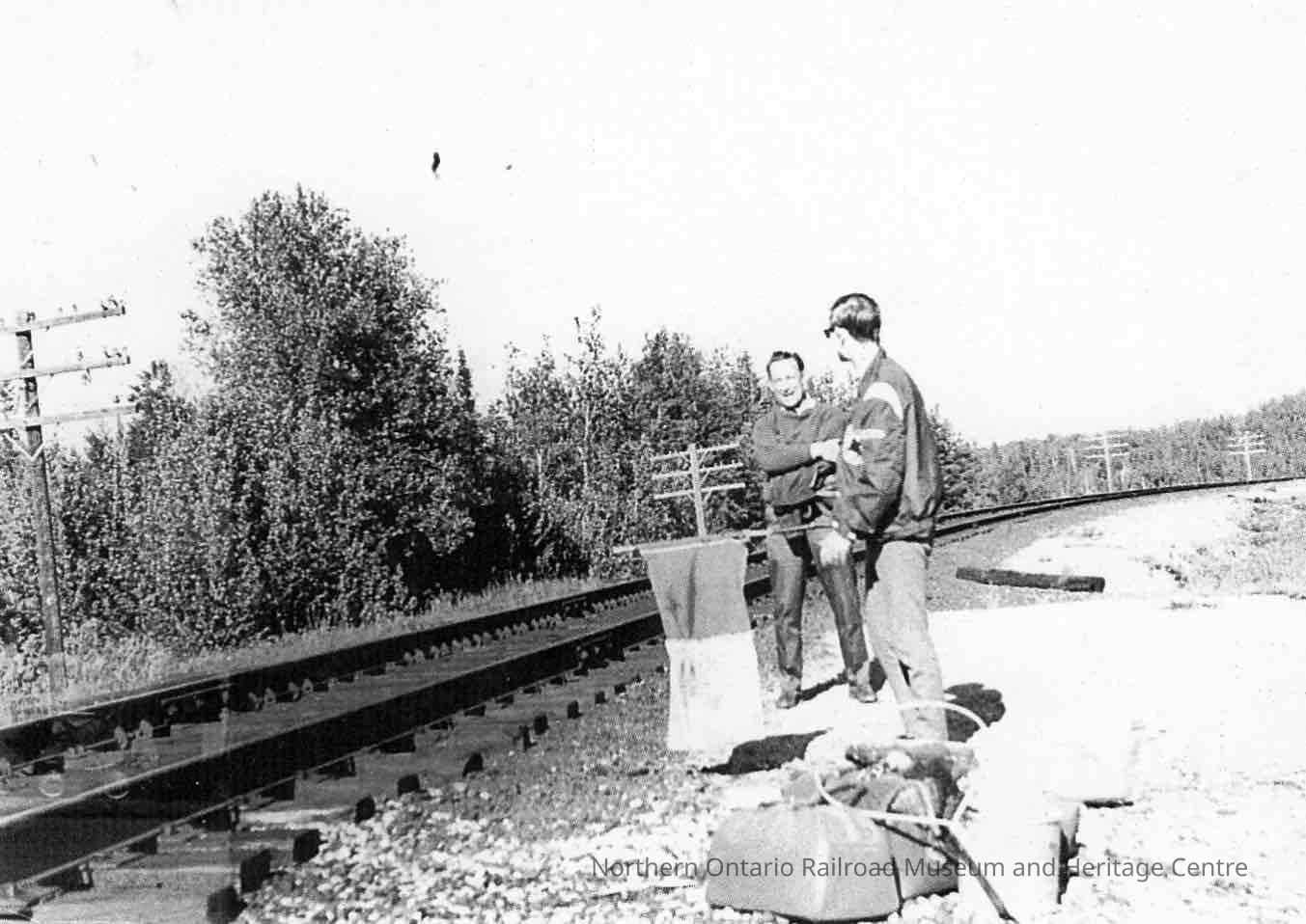 Photograph of Railroad Workers or tourists waiting to flag down a train for pickupDescription