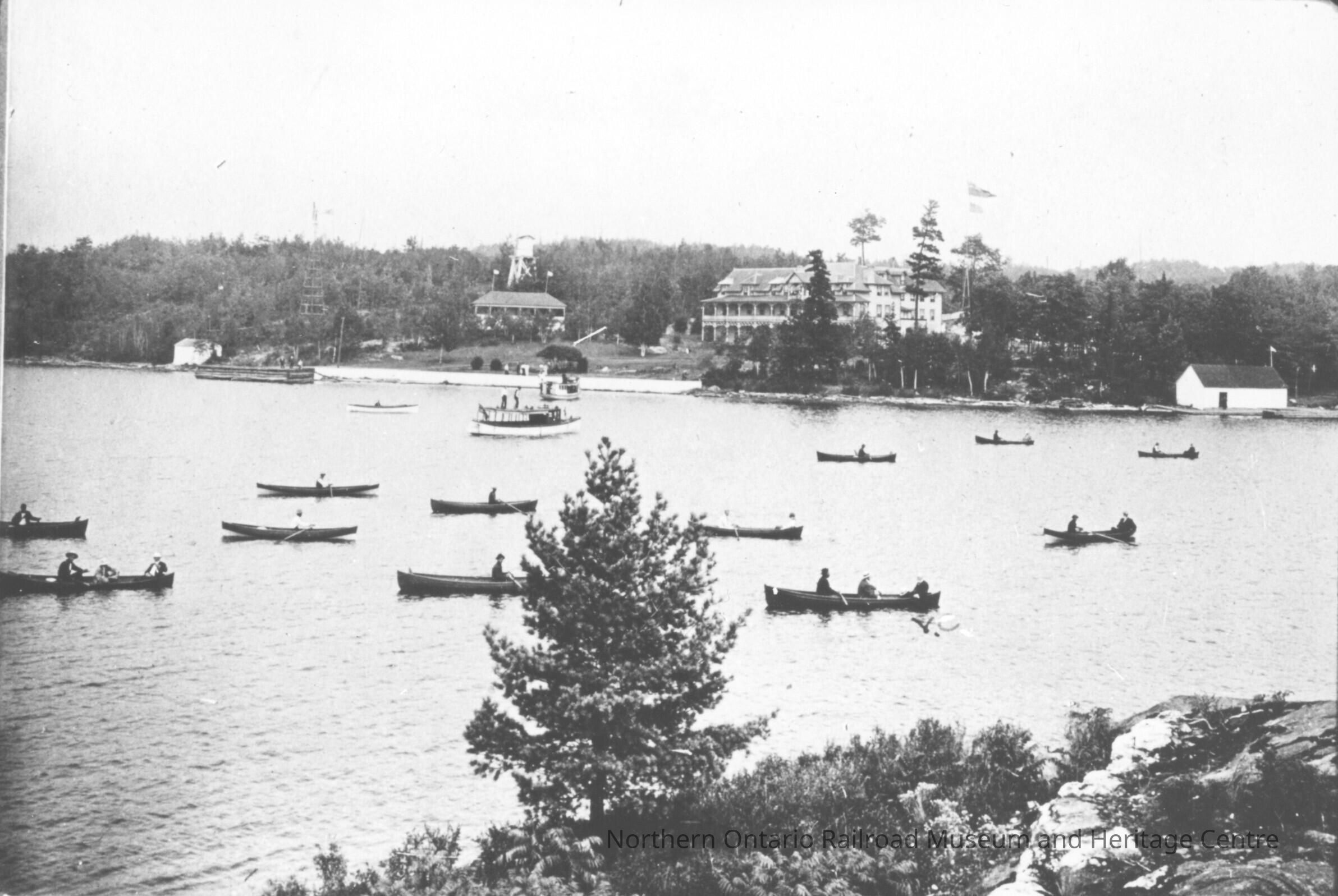 Black and white photograph of Rose Point in Parry Sound. The photo itself focuses on Lake Martin, the main body of water in the area. There are several people in row boats visible on the water as well as two small ferries. There are also several docks visible.