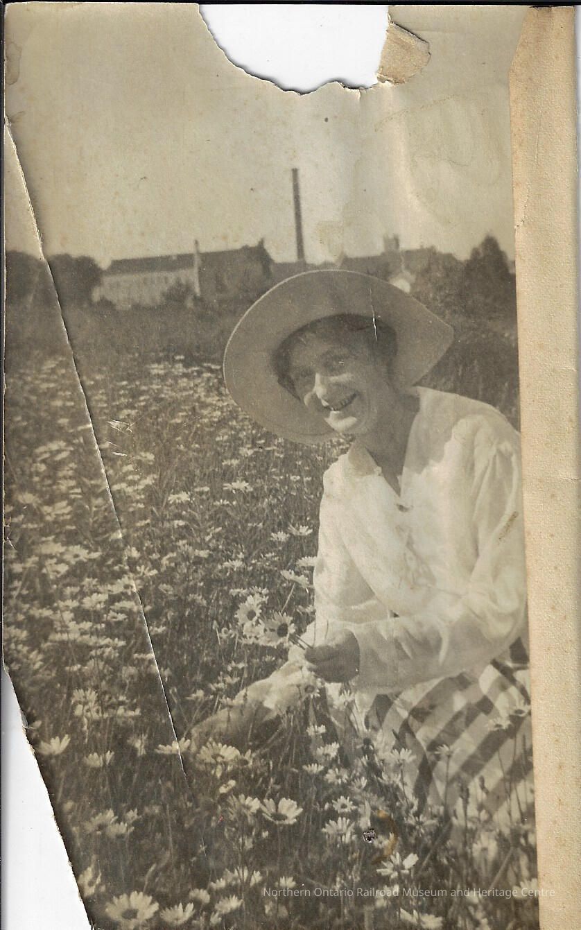 Black and white/sepia photograph of Ruth Taglabracci sitting in a field of wild flowers. Ruth is wearing a sun hat, a white long sleeve button down shirt, and a plaid long skirt. She is looking at the camera and smiling as she picks some of the wild flowers. She is assumed to be somewhere in Capreol.