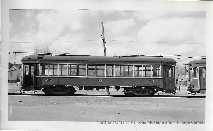 Photograph of a streetcar in Sudbury. It appears to be stopped mid-route, it is car number 33.Photograph Details