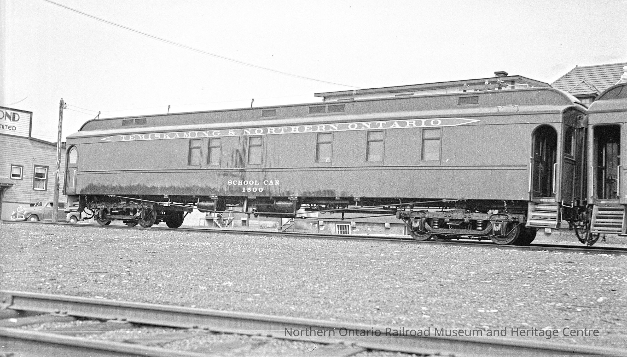 Photograph of the Temiskaming and Northern Ontario School Car No. 1, 1500 in North Bay Ontario circa 1945. The school car is stopped outside what appears to be a railway station. In the background there is a partial advertisement visible for a neighboring business as well as an automobile. It is a side view of the school car.