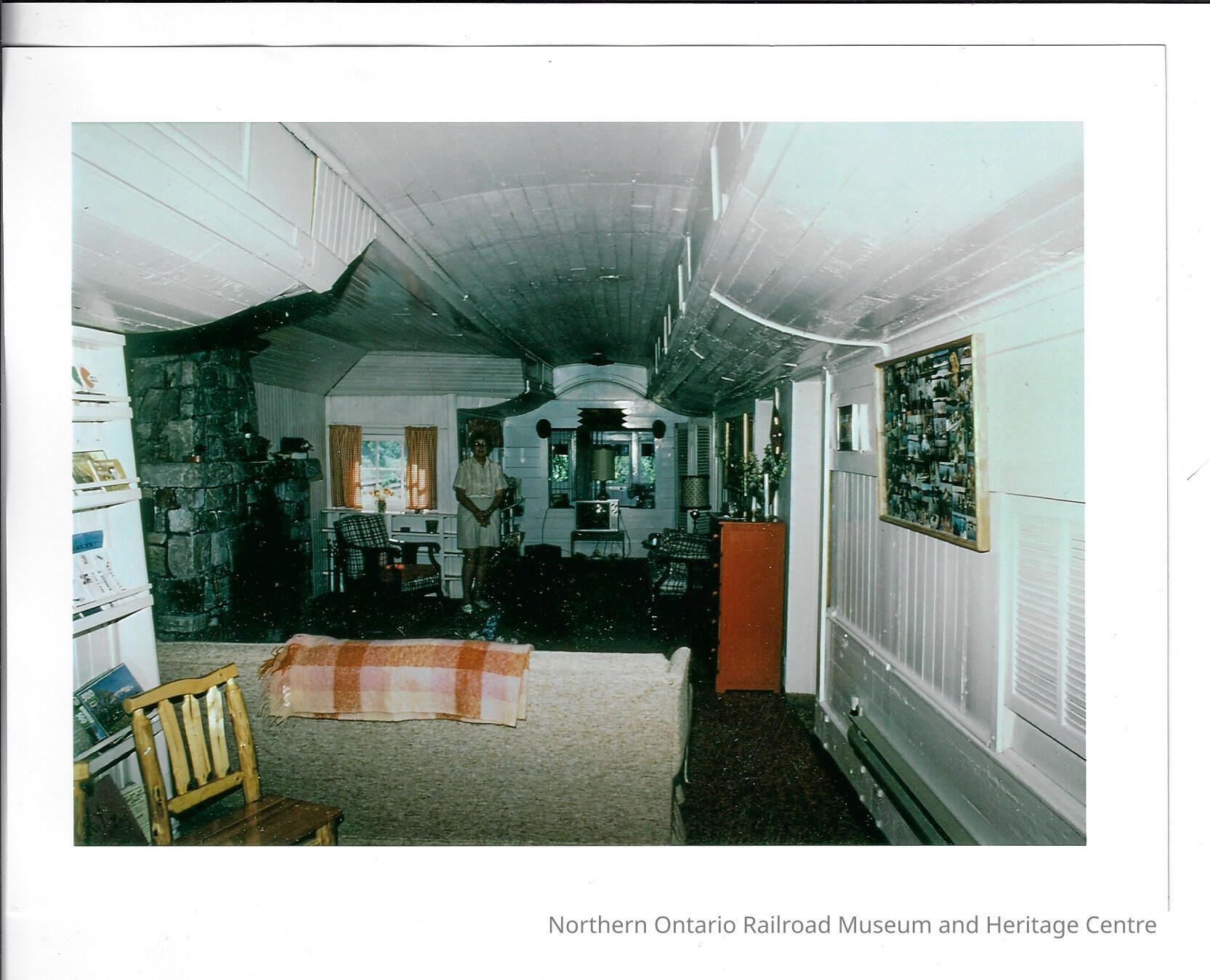 "Photo by KEITH C. HOPKIN" "NOTE NORMA JONES AT REAR" "INTERIOR OF OLD ALGOMA EASTERN COACH ONCE OWNED BY F. M. DONEGAN" "OWNED BY BILL & NORMA JONES IN 1975 TO 1997 THEY BOUGHT IT IN JULY 1, 1975"