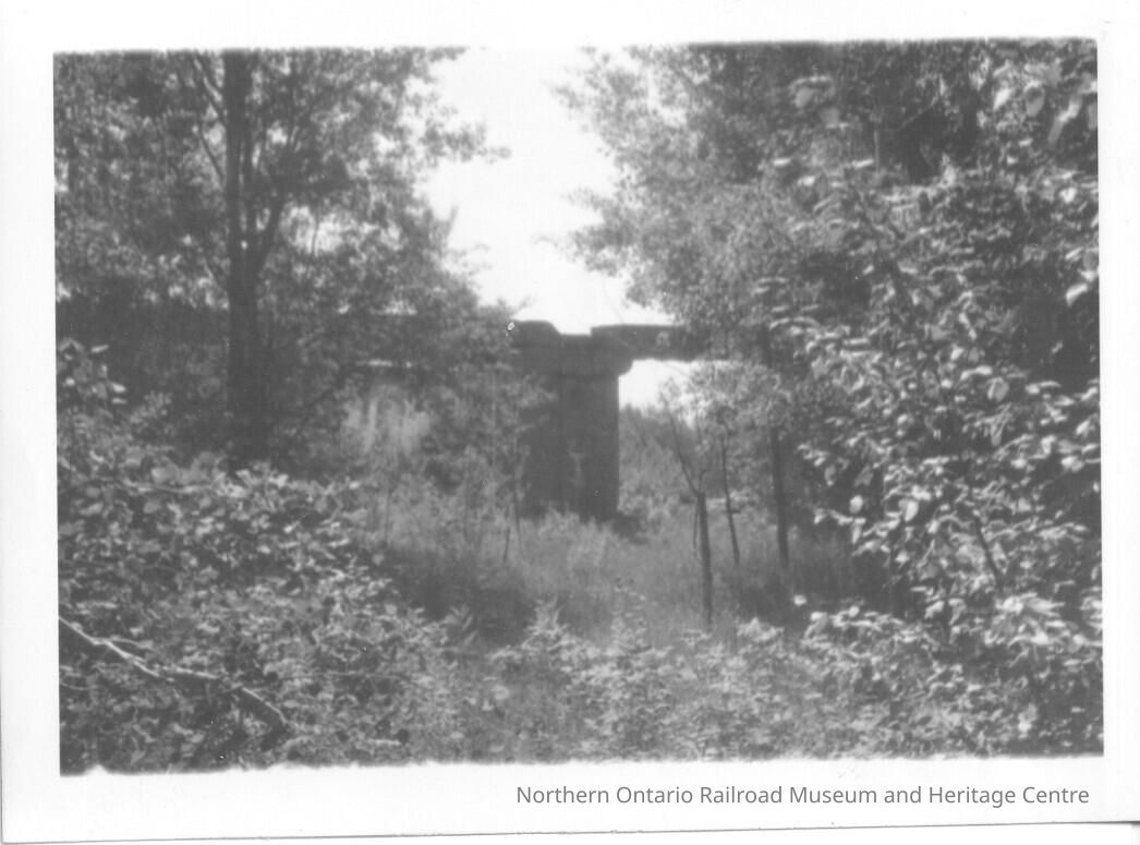 Black and white photograph showing part of the ruins of the Grand Trunk Railway in Depot Harbour. The photo itself is of what appears to be the remains of what was a bridge. It has been partially hidden by overgrowing trees.