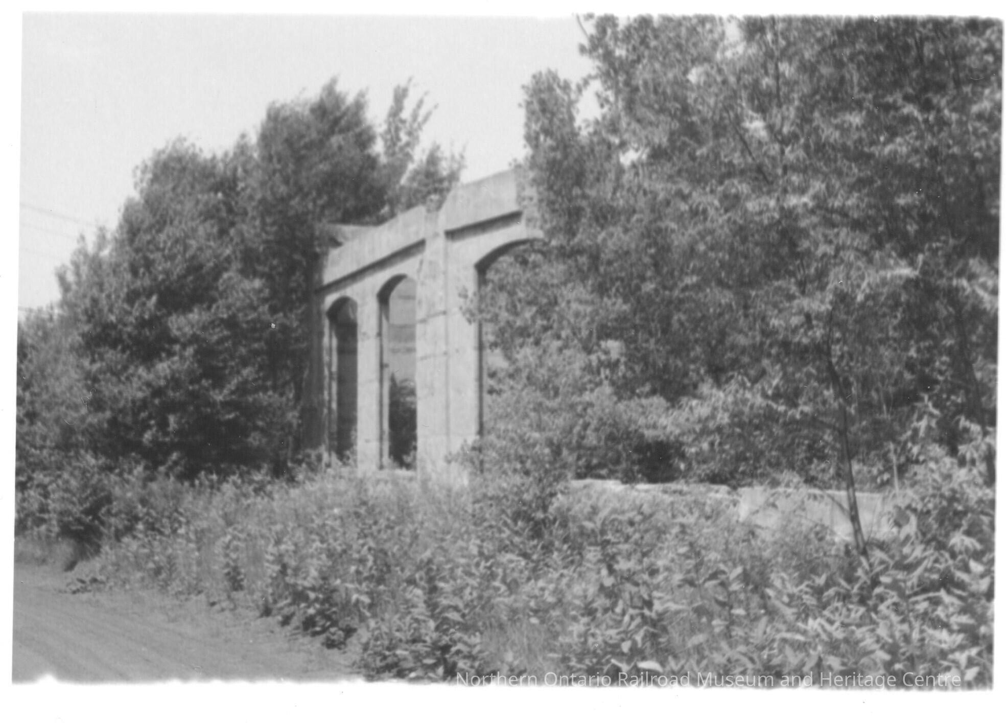 Black and white photograph showing the remains of the Grand Trunk Railway in Depot Harbour. The photo shows what appears to be an archway for a railway bridge.