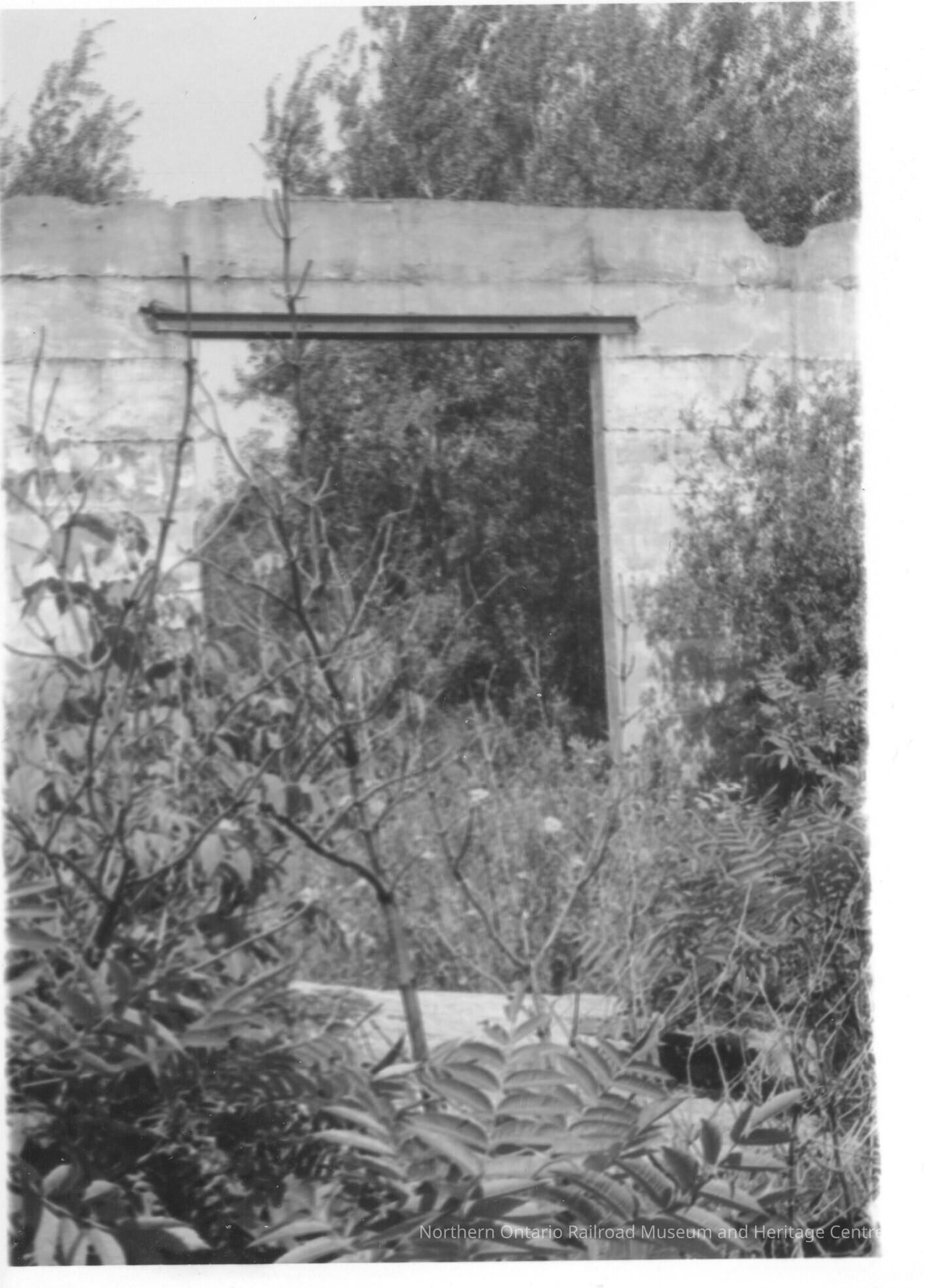 Black and white photograph showing the ruins of the Grand Trunk Railway in Depot Harbour. The photo shows what appears to be a portion of a railway bridge.