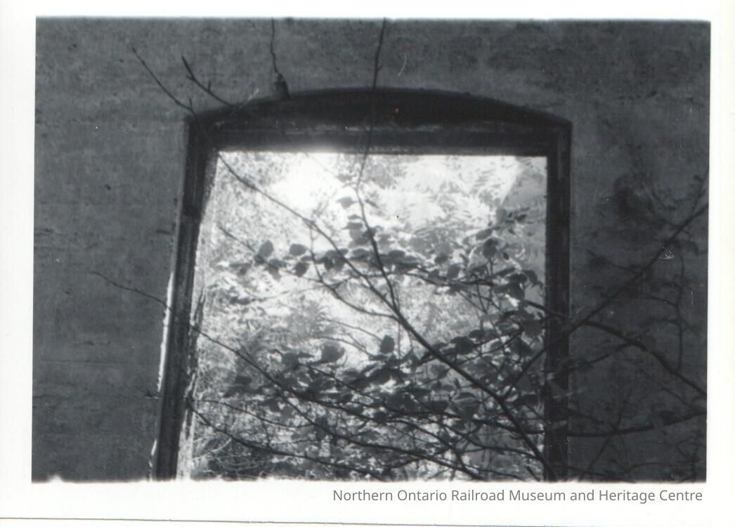 Black and white photograph of the ruins of the Grand Trunk Railway in Depot Harbour. This photo specifically shows the remnants of an archway which is assumed to be part of the roundhouse.