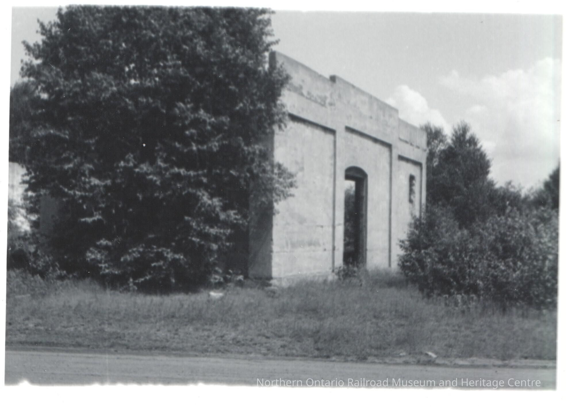 Black and white photograph showing the remains of the Grand Trunk Railway in Depot Harbour. The photo focuses on an archway which is assumed to be part of a roundhouse.