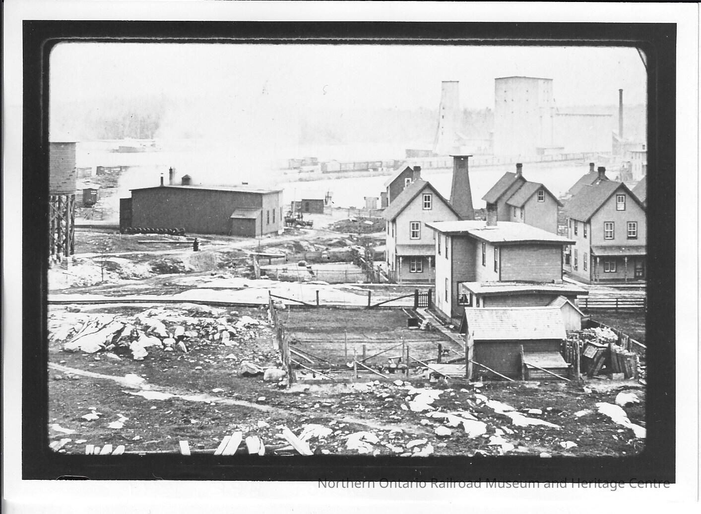 Black and white photograph of the town of Depot Harbour circa 1899. The photograph shows several houses as well as a railway track, water tower, and a warehouse in the background.
