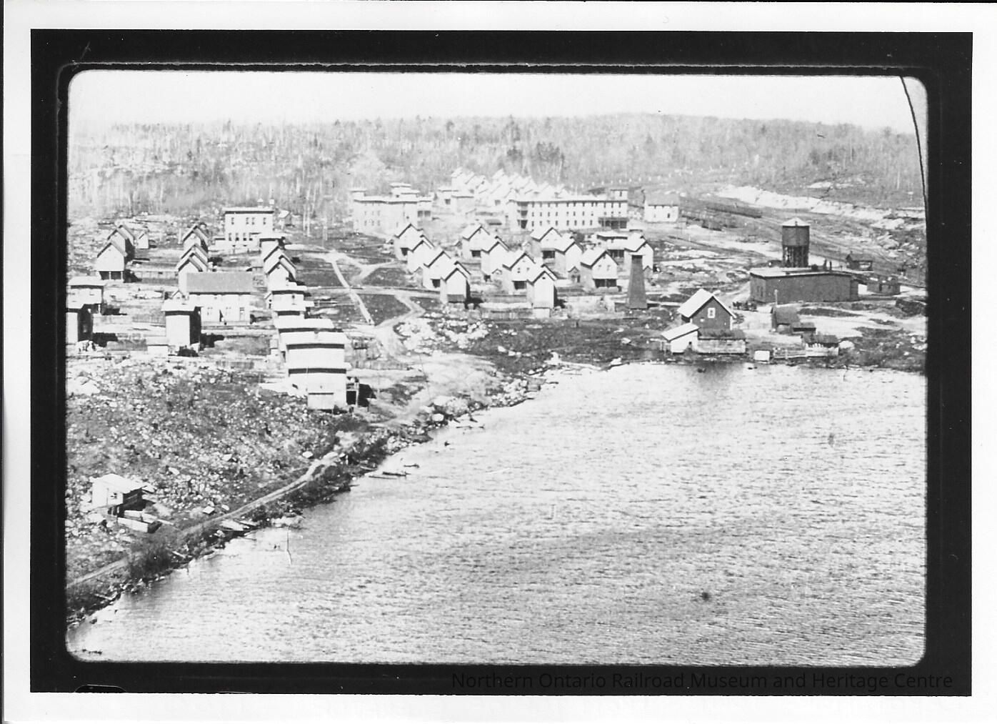 Black and white photograph of the town of Depot Harbour. The photograph was taken from the top of an elevator and is an arial shot of the town. The lake is visible as well as several houses, railway tracks, and a warehouse.